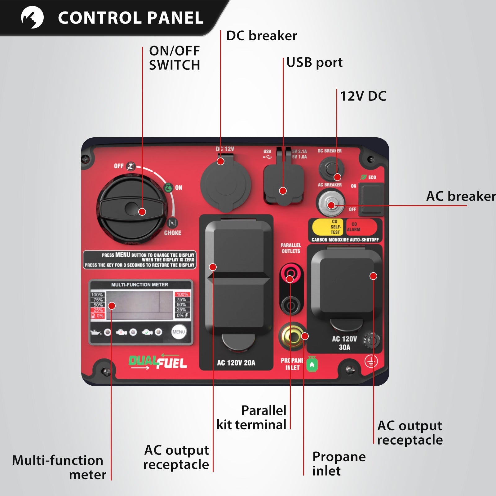 - Dual Fuel – Runs on 3800W/3500W gasoline or propane for flexible fueling