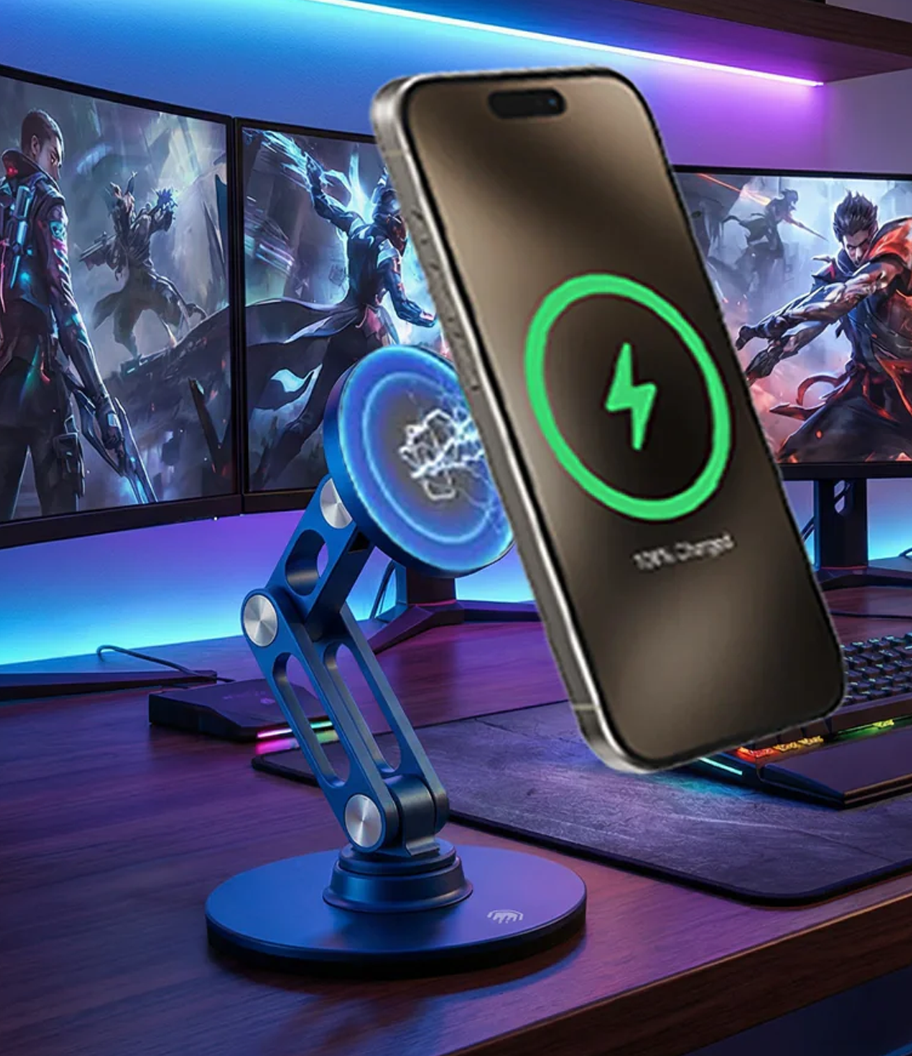 Gentlemen's Blue ClikDock Wireless MagSafe Cellphone Charging Stand for iPhone and Android.