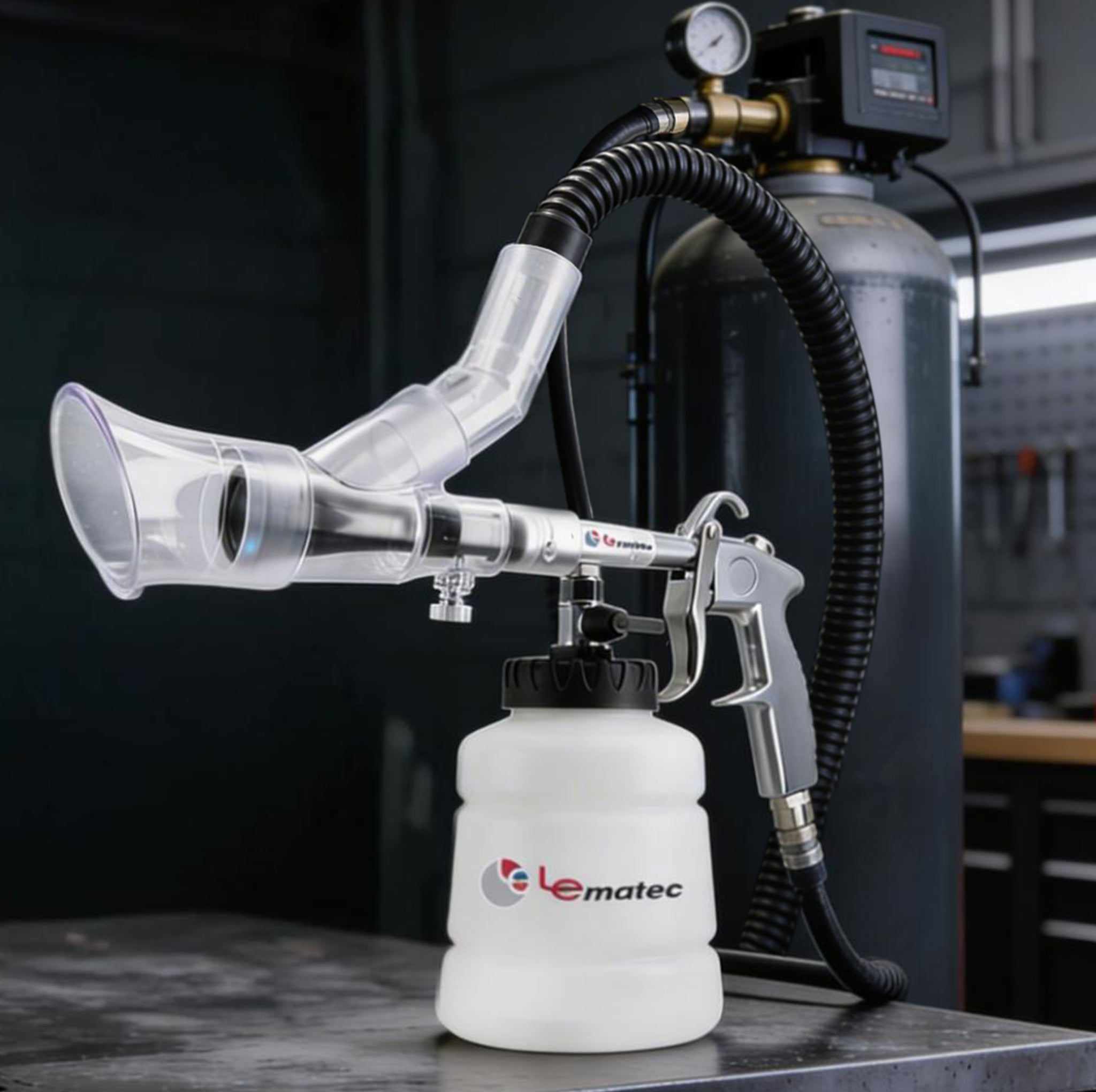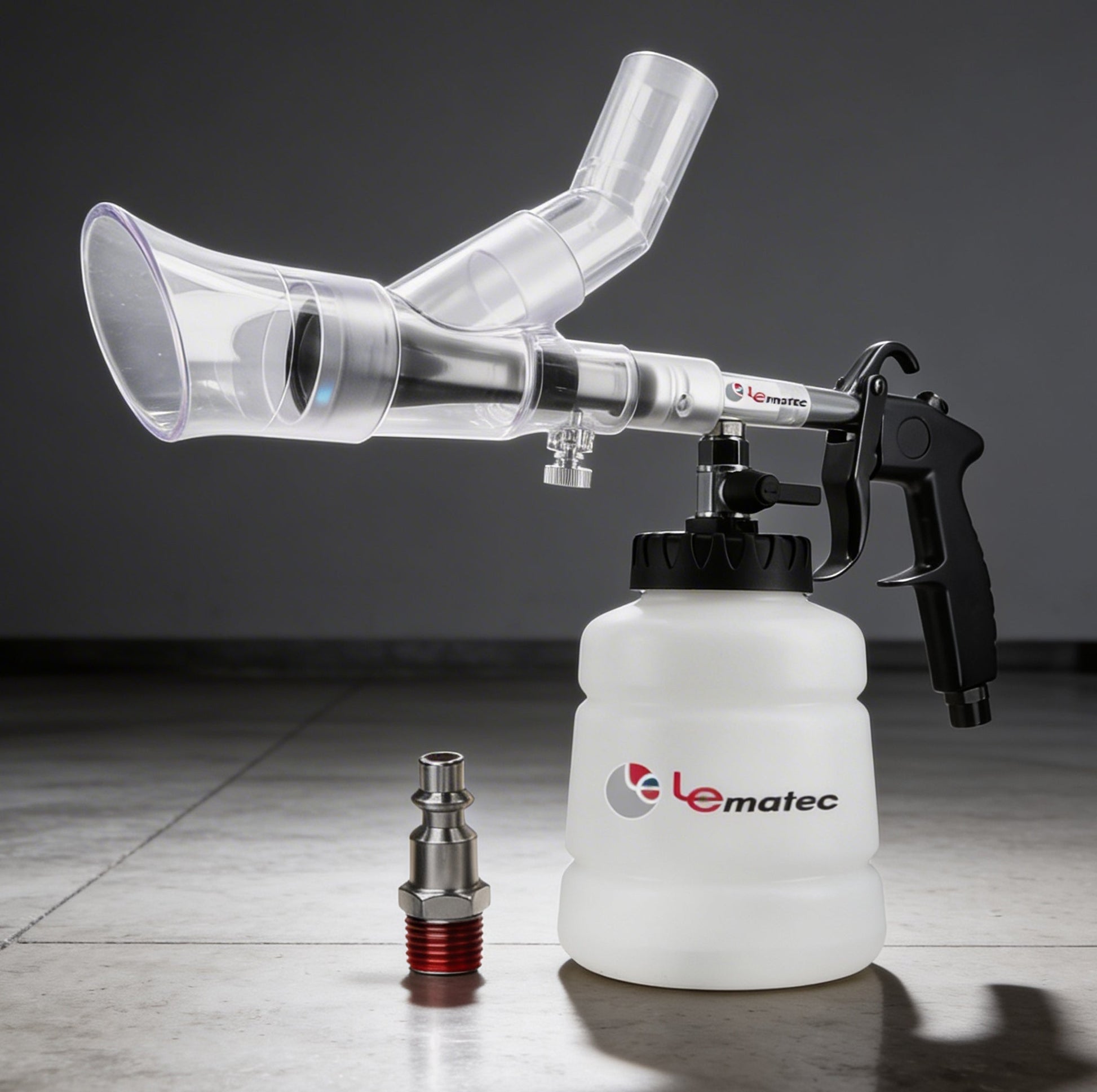 The Le Lematec Auto Detailing Kit is a dual-function tool — it operates as both a high-pressure cleaning gun and a liquid extractor. You can blast dirt loose and then extract spilled liquids from upholstery in one tool.