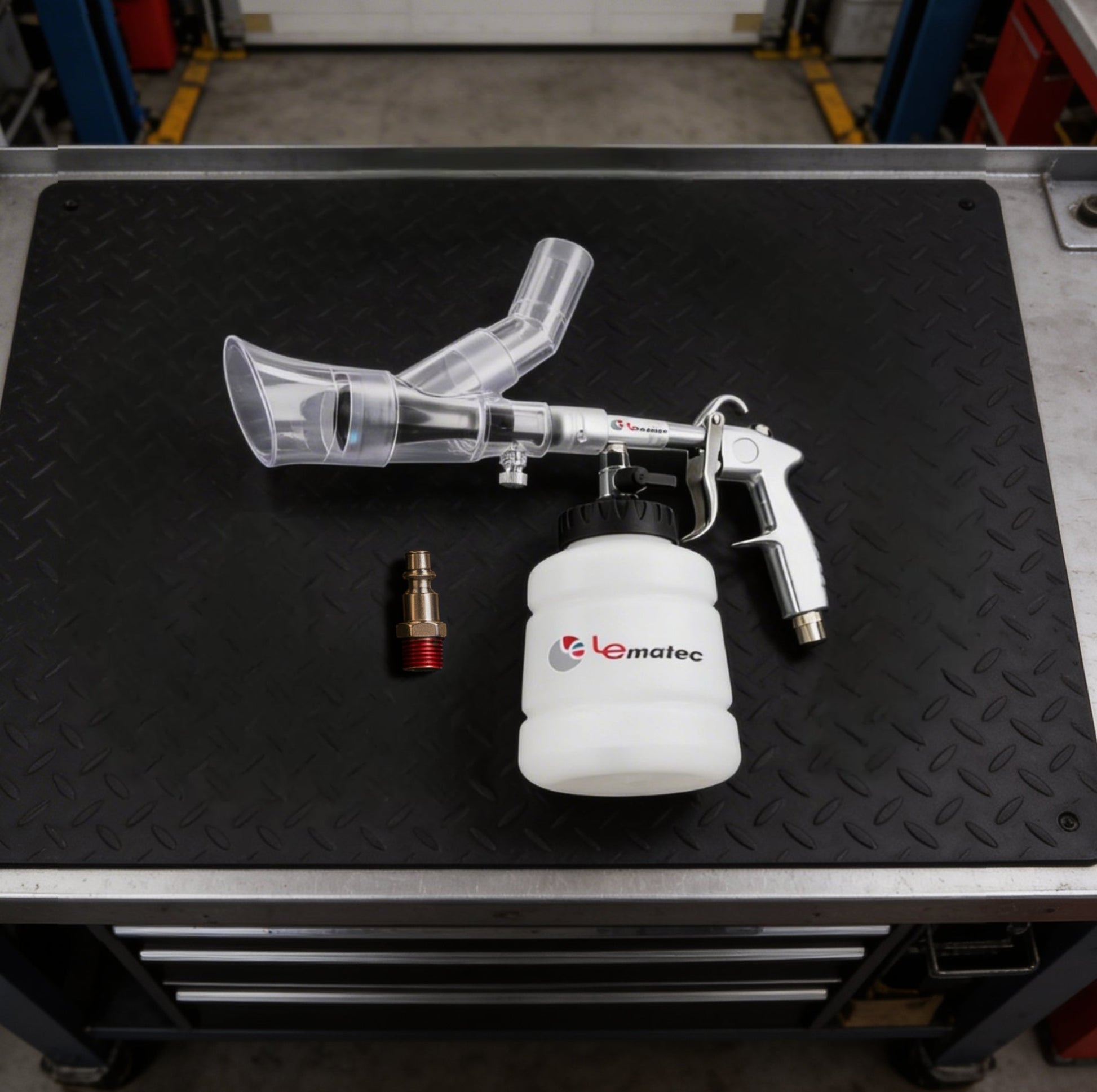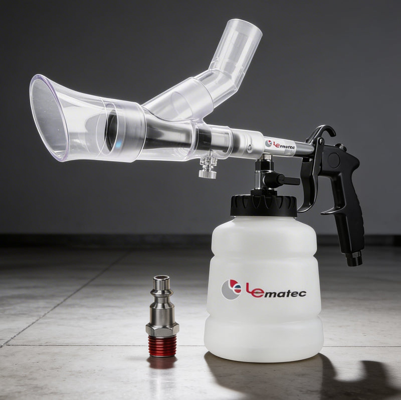 The Le Lematec Auto Detailing Kit operates at 3,000 RPM and includes a high-pressure cleaning gun and liquid extractor. Dual-function tool for both blasting dirt and extracting spilled liquids from upholstery and carpets. Price: ~$89. Factory direct from Le Lematec.