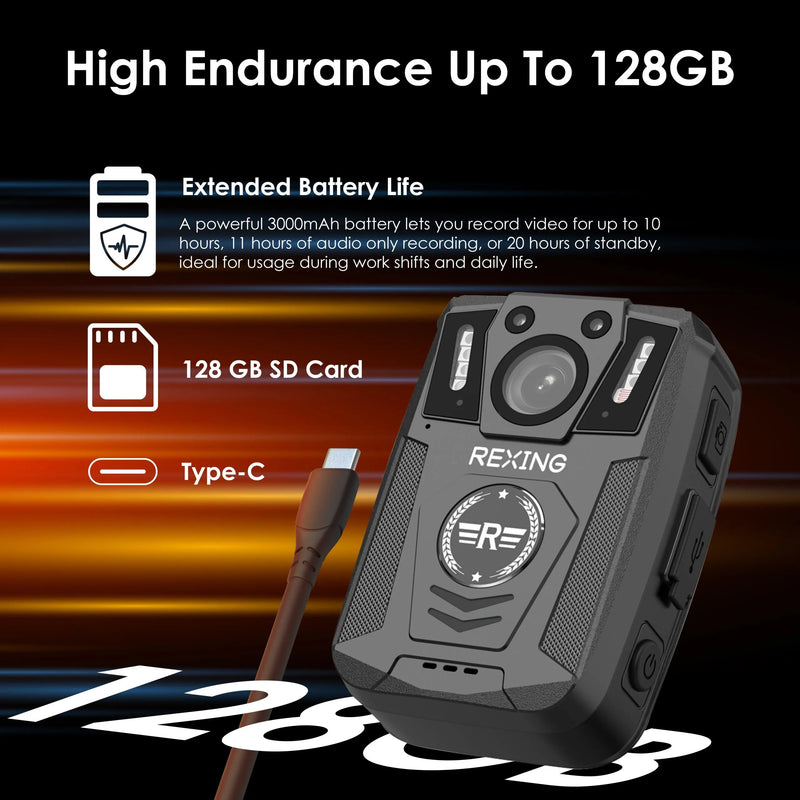 - Extended Recording Time - With a 128GB memory capacity, the body camera can record for longer periods without needing frequent file transfers or memory card replacements.