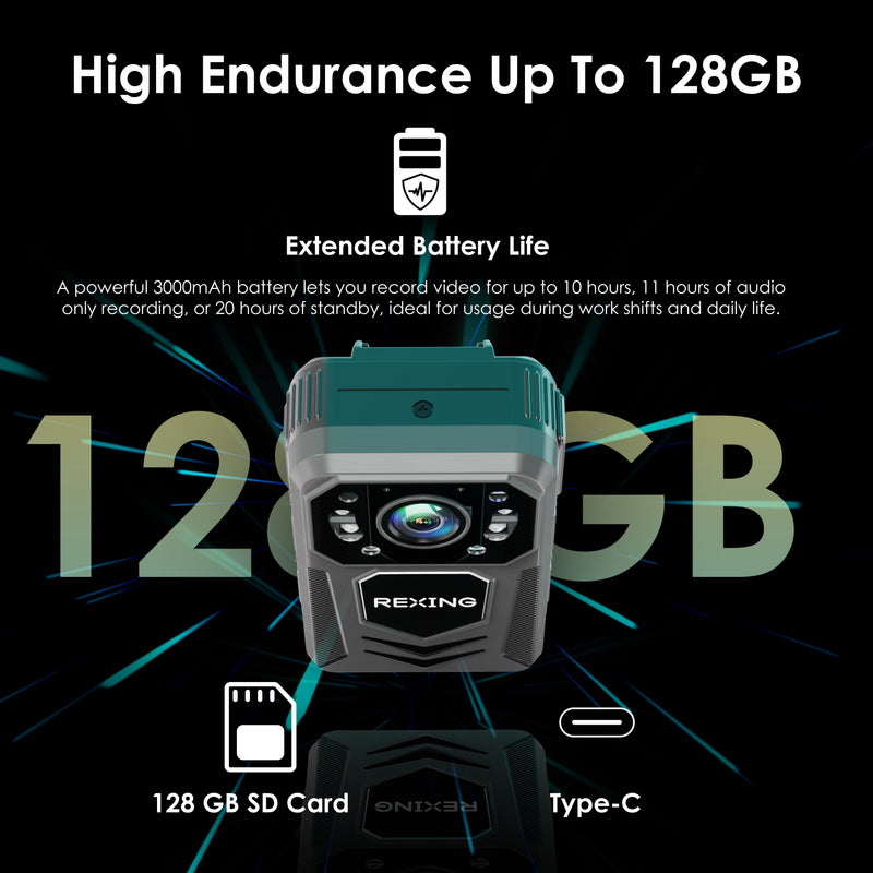 Long Battery Life & Ample Storage – Equipped with a rechargeable battery for up to 10 hours of recording, and supports Micro SD cards up to 128GB for extended coverage.