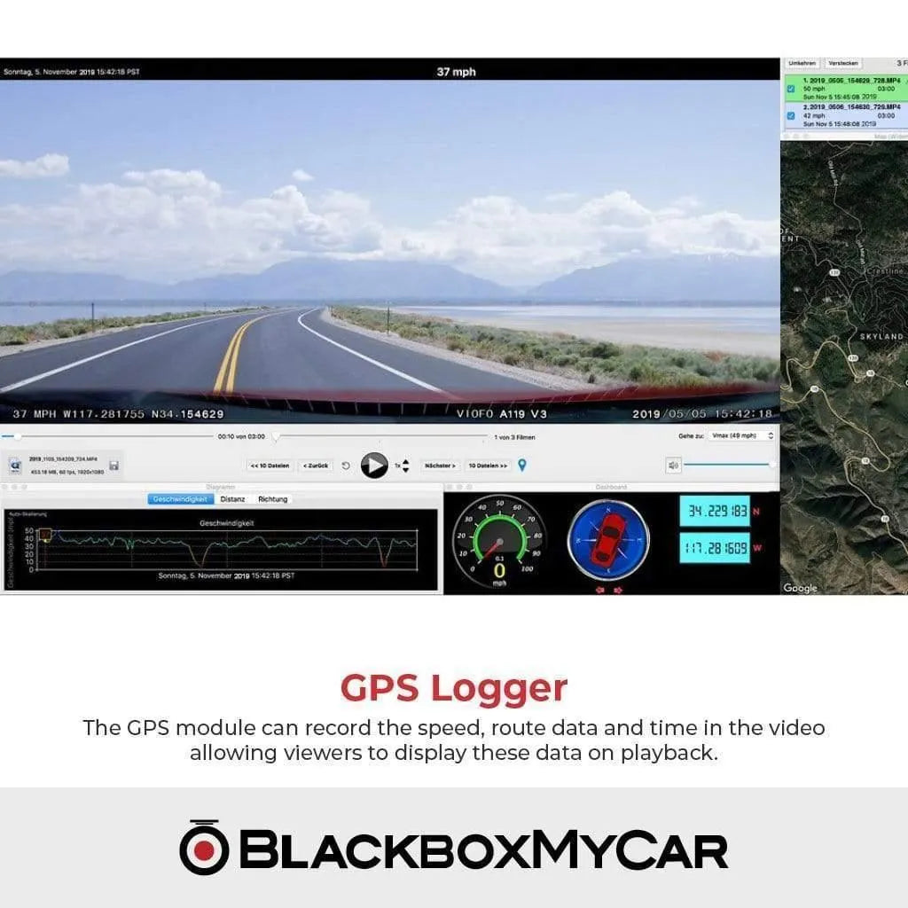 The VIOFO A119 V3 comes with an external GPS module. With this GPS, you can record your speed and route data in your video footage files. The GPS will also synchronize the A119 V3's clock with the GPS time, ensuring that your video files are correctly time-stamped.