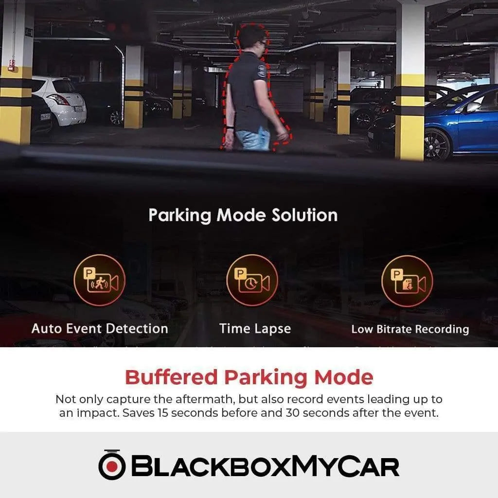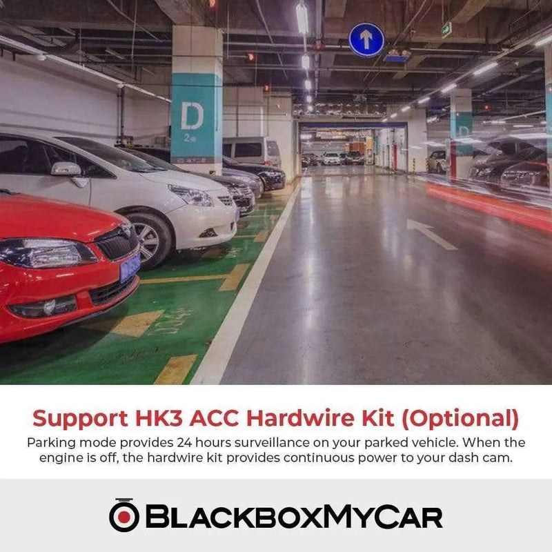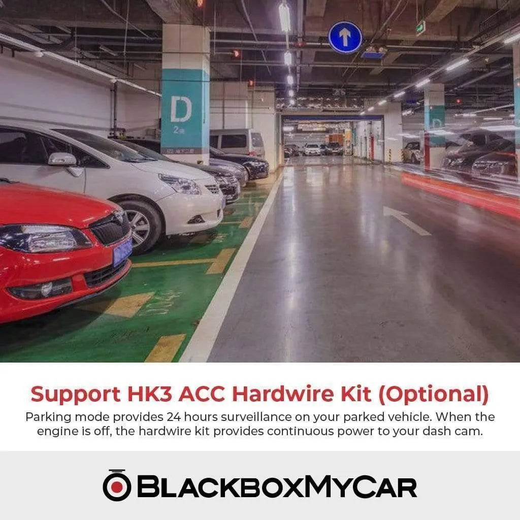 To enable the parking mode, you will need a 3-wire hardwiring cable or an external battery pack, such as the BlackboxMyCar PowerCell 8 Battery Pack.
